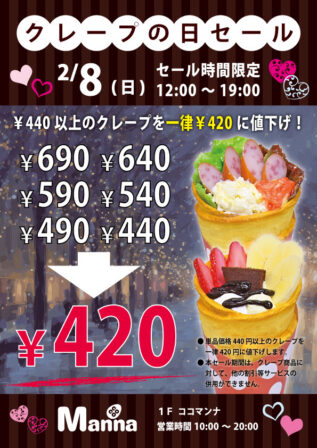 ココマンナです!! 2/8(日)クレープの日セールを開催します!!