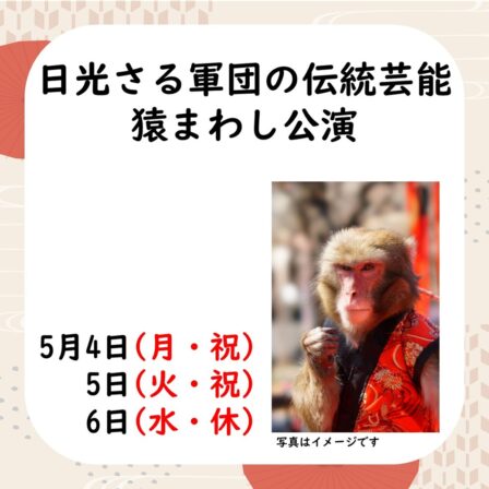 日光さる軍団の伝統芸能猿まわし公演 5月4日(月・祝)~6日(水・祝)