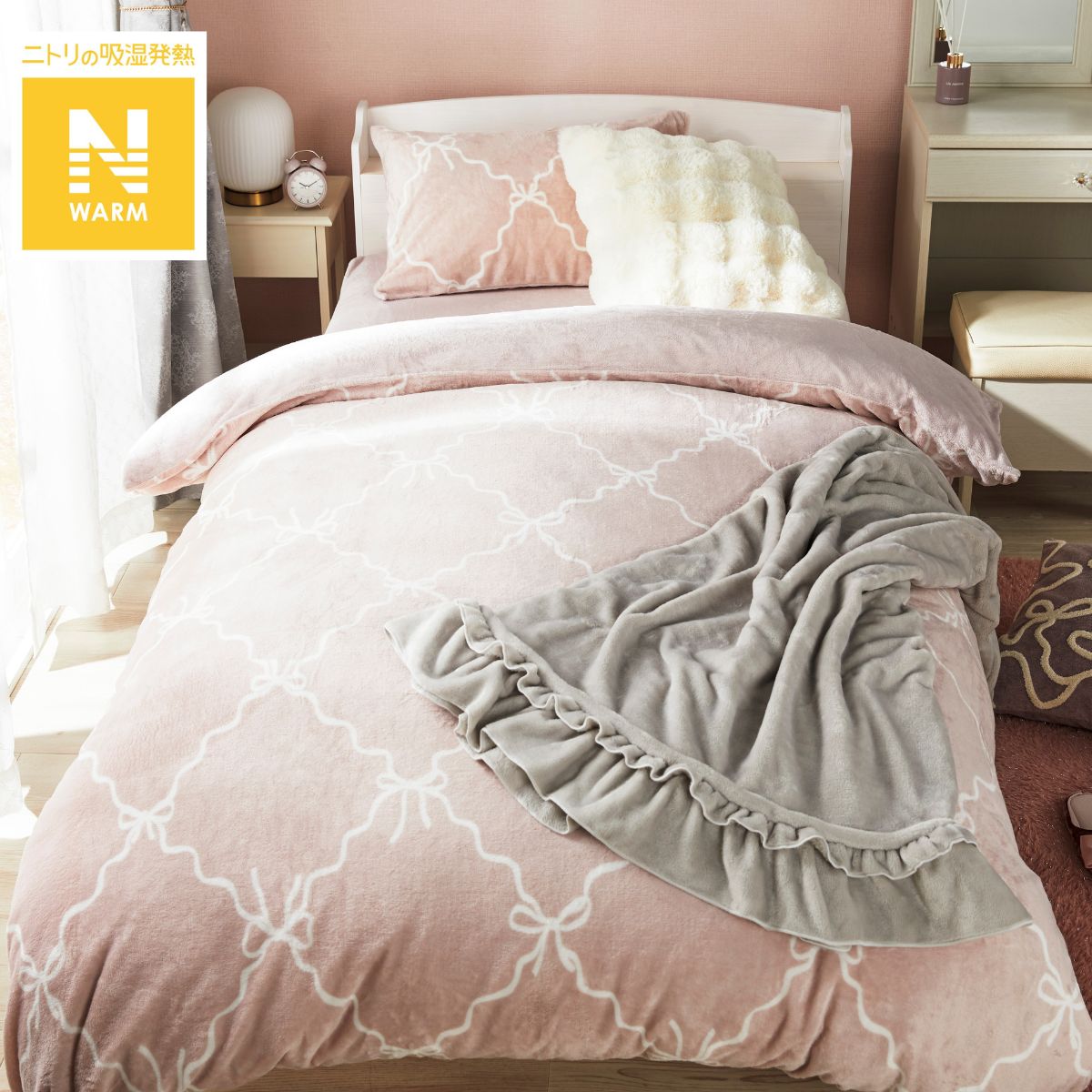 まくらカバー(Nウォーム) 699円(税込)淡い色合いのローズカラーに、繊細なタッチのリボン柄。おしゃれでフェミニンな印象に♡