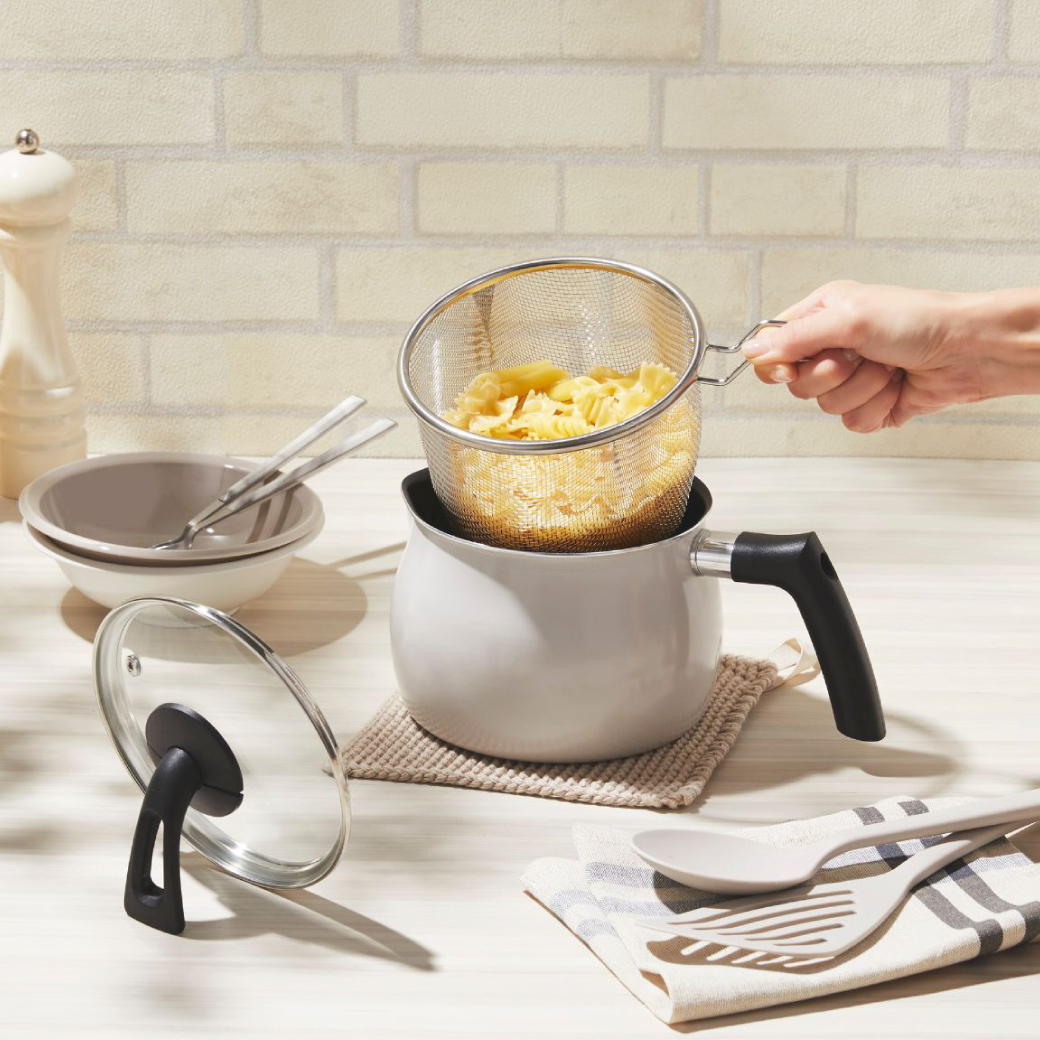 麺茹でや揚げ物などの調理に便利なストレーナー付き!