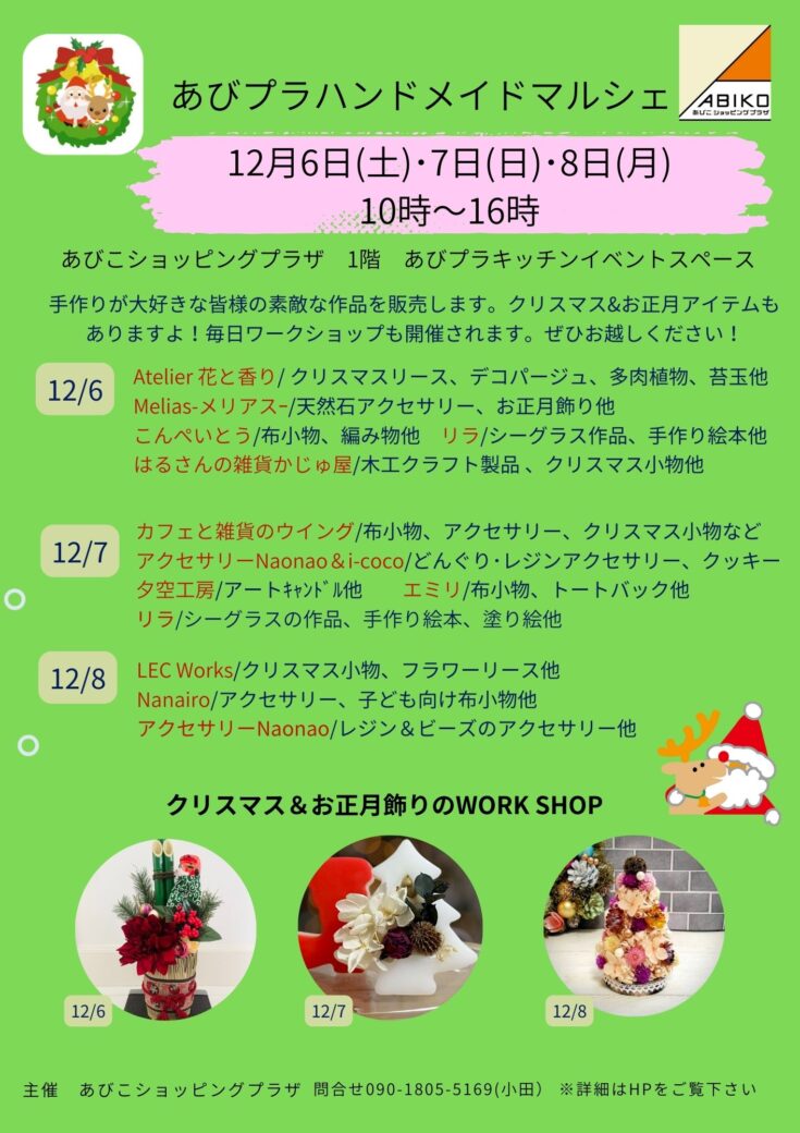 手作りが大好きな皆さまのクリスマスやお正月アイテムをはじめとした素敵な作品を販売します。日替わりでワークショップも同時開催。
