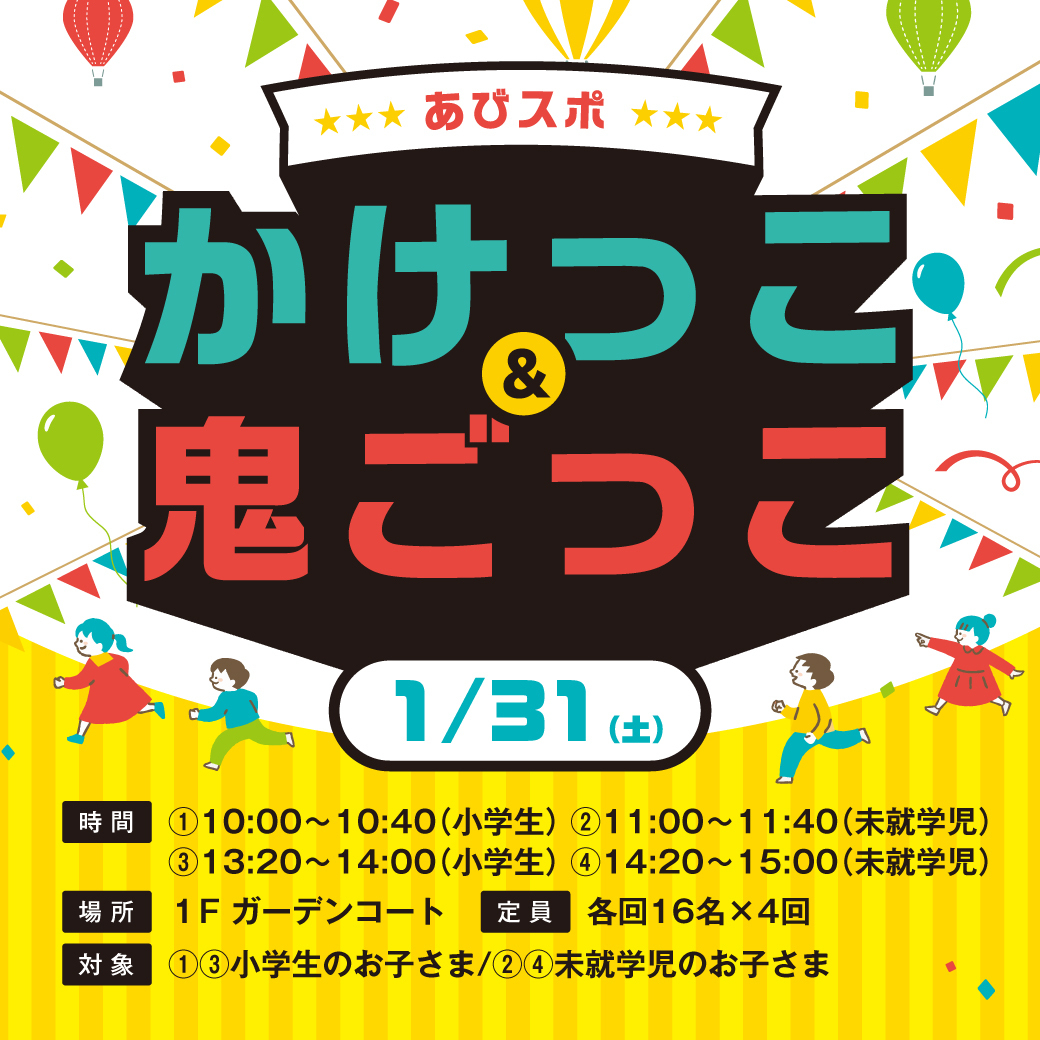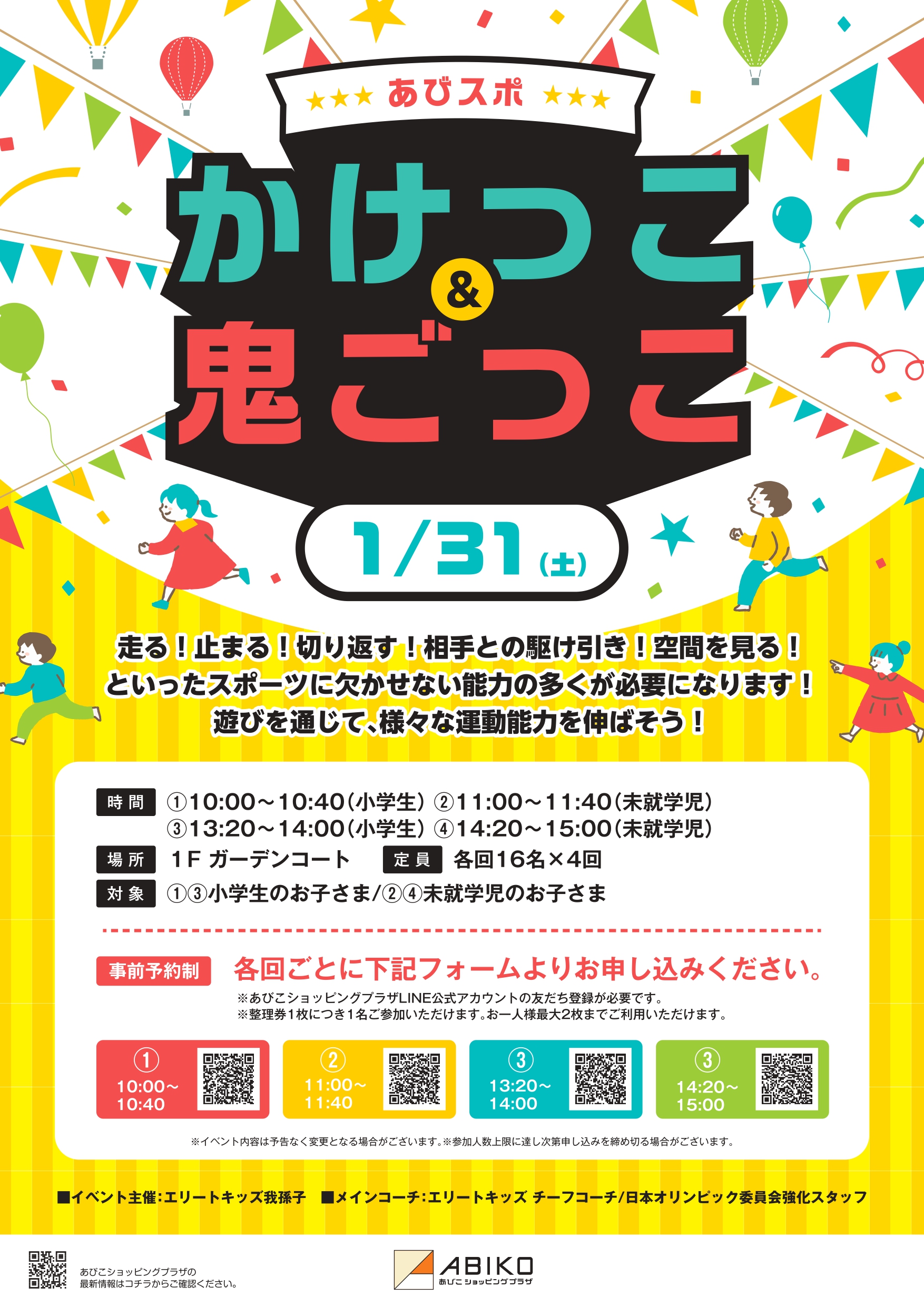 ①10:00~10:40(小学生)②11:00~11:40(未就学児)③13:20~14:00(小学生)④14:20~15:00(未就学児)