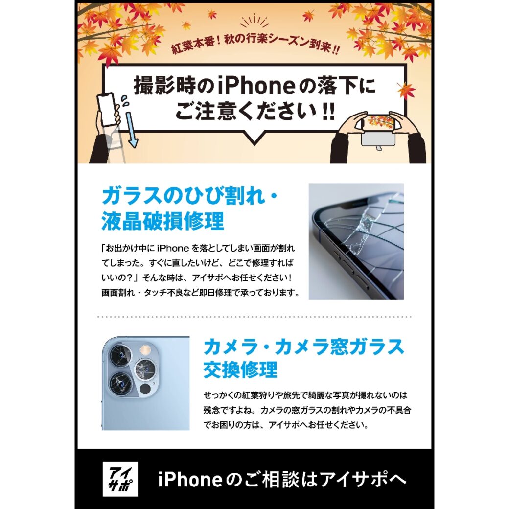 秋の思い出を快適なiPhoneで残すために、ぜひザ・クロックハウス内アイサポあびこショッピングプラザ店へご相談ください!